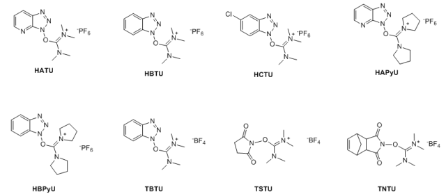 許多鹽縮合劑被相繼開發(fā)出來用于酰胺的縮合反應(yīng),從鹽的種類來分,主要有兩類,一類是碳鎓鹽,目前常用的為O-(7-氮雜苯并三氮唑-1-基)-二(二甲胺基)碳鎓六氟磷酸鹽(HATU)、O-(苯并三氮唑-1-基)-二(二甲胺基)碳鎓六氟磷酸鹽(HBTU)、O-(5-氯苯并三氮唑-1-基)-二(二甲胺基)碳鎓六氟磷酸鹽(HCTU)、O-(苯并三氮唑-1-基)-二(二甲胺基)碳鎓四氟硼酸鹽(TBTU)、O-(N-丁二酰亞胺基)-二(二甲胺基)碳鎓四氟硼酸鹽(TSTU)、O-(N-endo-5-降莰烯-2,3-二碳二酰亞胺)-二(二甲胺基)碳鎓四氟硼酸鹽(TNTU)等。
